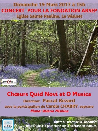 L'ensemble vocal du Vésinet comportant 2 choeurs d'adultes et 2 choeurs d'enfants et d'ados, avec les choeurs Quid Novi, se produira ce dimanche 19 mars 2017 à 15 heures à l'église Sainte Pauline du Vésinet avec le programme suivant : chants de la Renaissance et Magnificat de Vivaldi, sous la direction de Pascal Bézard et la participation de Carole Chabry. Au piano, Valéria Mishina.