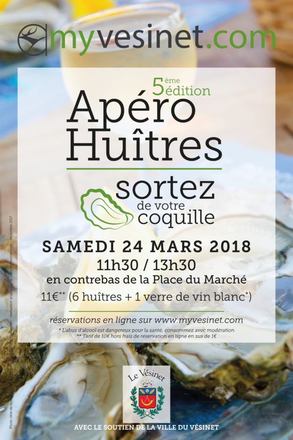 En raison de prévisions météorologiques, l'association Myvesinet nous informe que l'apéro huitres aura lieu le samedi 24 mars 2018 de 11h30 à 13h30 au lieu du 17 mars, en contrebas de la place du Marché.