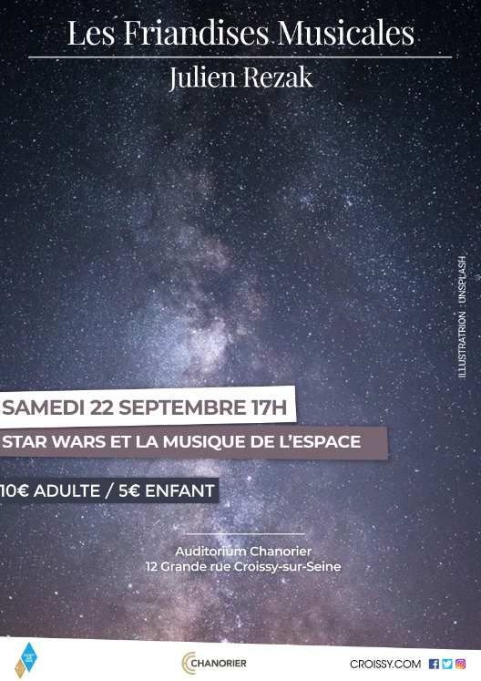La ville de Croissy sur Seine nous informe du concert Les Friandises Musicales sur le thème de Star Wars et la musique de l'espace" présentées par Julien Rezak le samedi 22 septembre 2018 à 17 h animées par l'école de musique de Croissy.