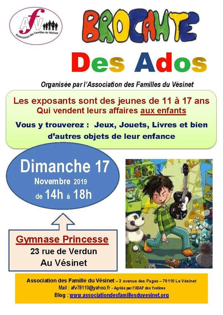 L'Association des Familles du Vésinet organise une Brocante Ados le dimanche 17 novembre 2019 de 14h à 18h au gymnase Princesse (23 rue de Verdun au Vésinet, juste à coté de l'école Élémentaire Princesse).